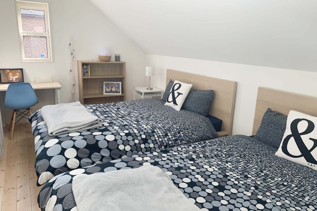 ベッドルーム01にはデスクとチェアを設置しており、仕事や勉強をする際に便利です。ワーケーション のご利用としてもオススメです。ダブルベッド2台と、セミダブルベッド1台の間には、背丈ほどの簡単な間仕切りがあります。(エリアは完全には分かれておりません)