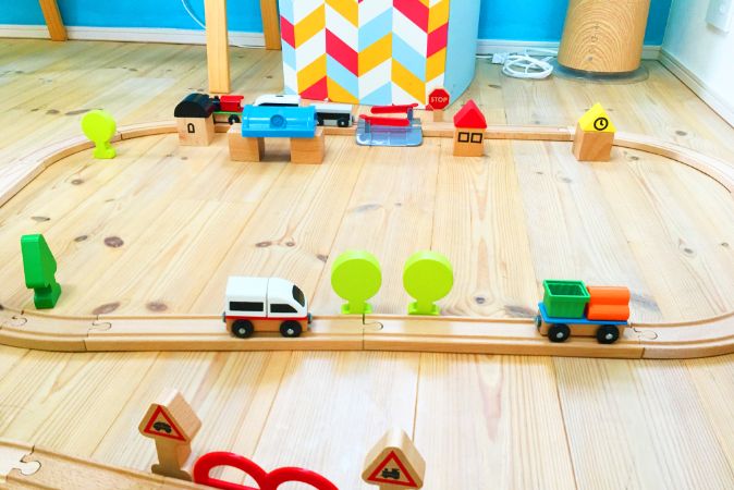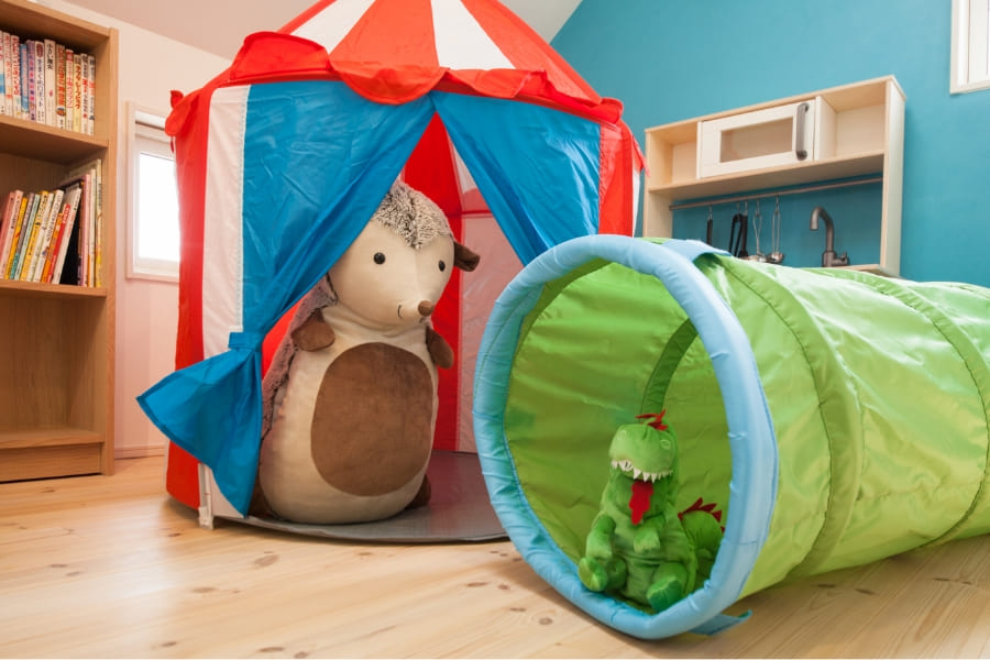 2階のフリースペースの一角に設けたキッズエリアです。お子様だけで十分楽しんで頂けるように、絵本、積み木、電車セット、おままごとセット、テント、マットなど、各種おもちゃ等をご用意しております。階段にはベビーゲートを設置しており、大人の方がお子様から目を離しても安心です!
