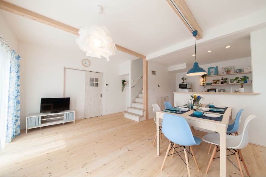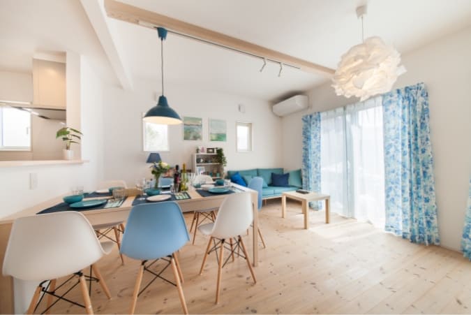 Soraの名前の通り、きれいなスカイブルーで統一したインテリアの、約12畳のリビングダイニングです。ご家族やお仲間で楽しくお過ごし頂けるよう、各種パーティーゲームやDVDプレイヤー等をご用意しております。