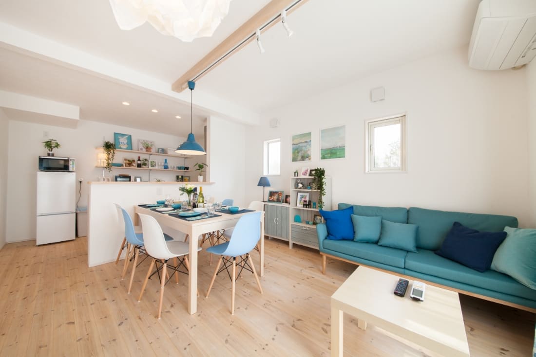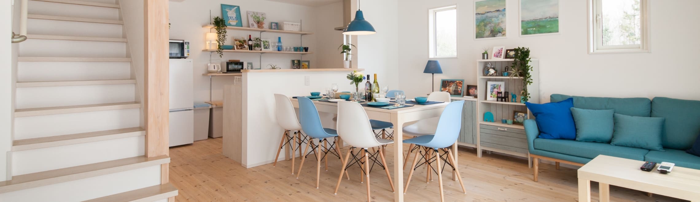 Soraの名前の通り、きれいなスカイブルーで統一したインテリアの、約12畳のリビングダイニングです。ご家族やお仲間で楽しくお過ごし頂けるよう、各種パーティーゲームやDVDプレイヤー等をご用意しております。